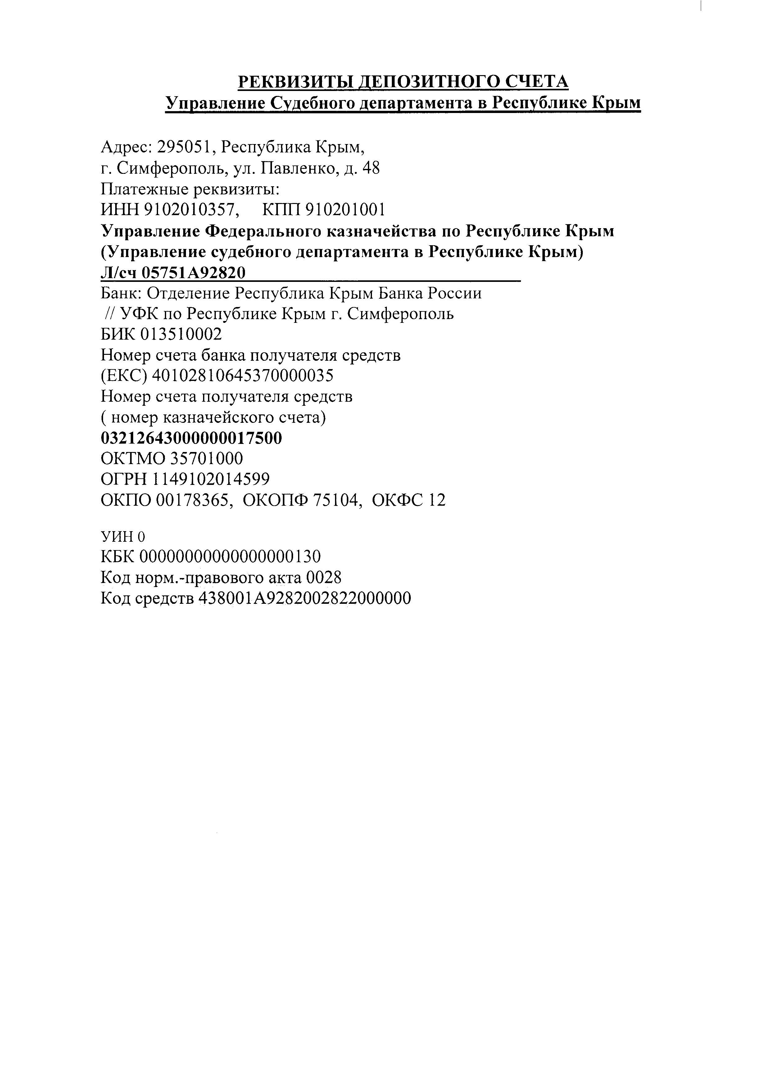 Реквизиты депозитного счета УСД в Республике Крым